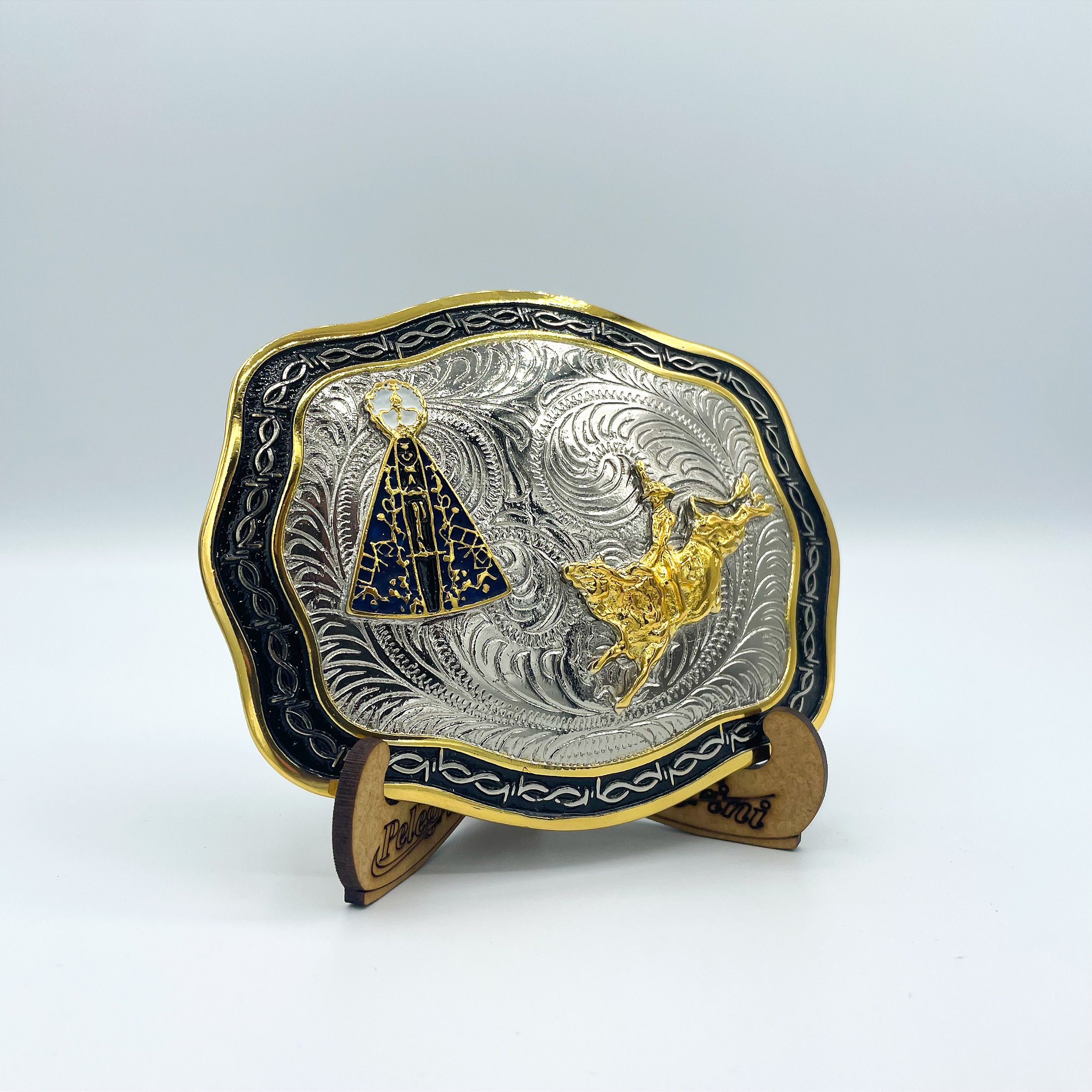 Fivela country com design sofisticado, unindo devoção e tradição western. Em destaque, Nossa Senhora Aparecida com acabamento esmaltado em azul e dourado, ao lado de um cavaleiro em montaria, representando fé, coragem e o espírito do rodeio. Produzida em metal de alta qualidade, essa fivela combina os tons prata, dourado e preto, com arabescos detalhados e bordas trabalhadas. Ideal para cowboys, vaqueiros e devotos que desejam carregar estilo e espiritualidade em festas de peão, montarias e eventos sertanejos.