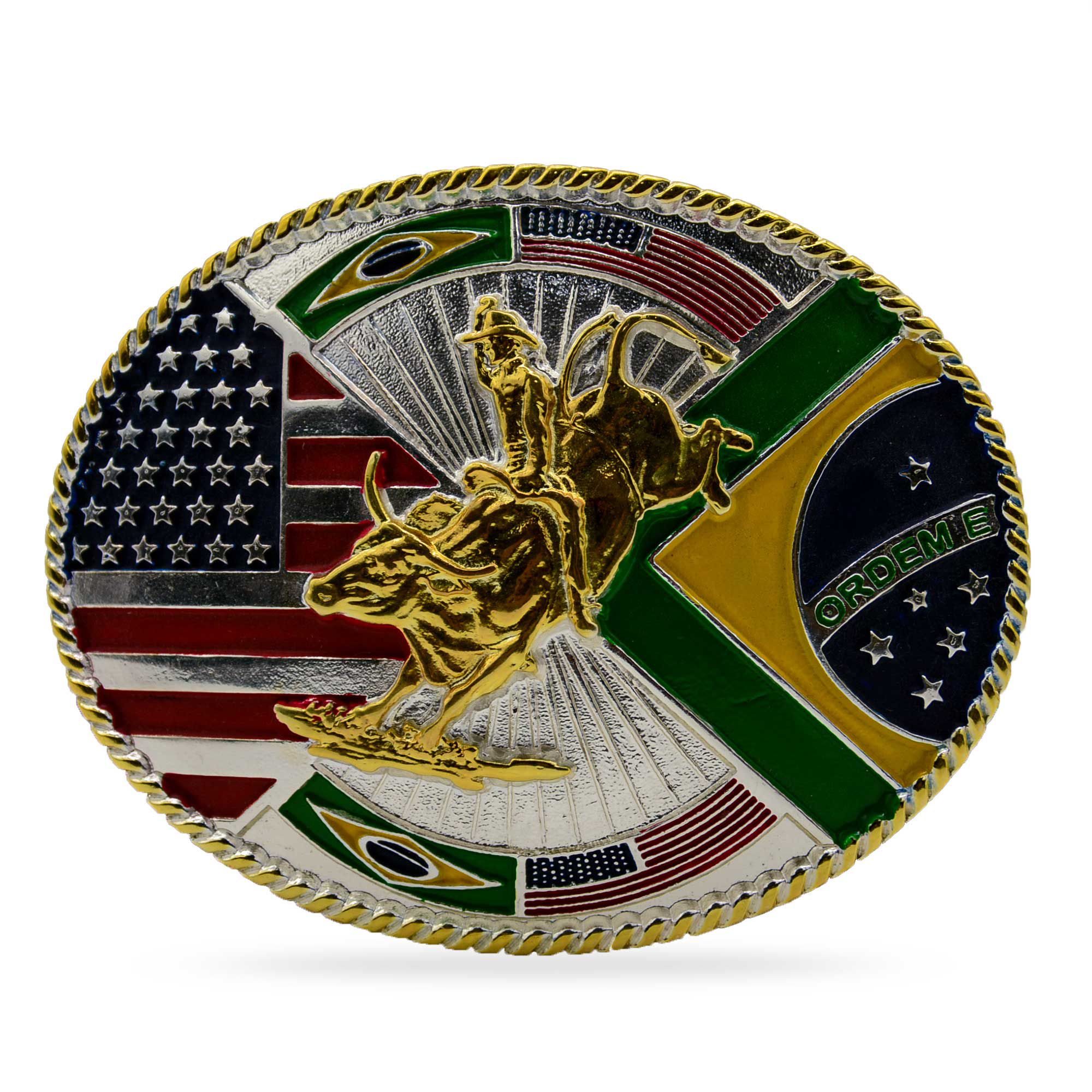 Adquira agora a Fivela Boiadeira - Bandeira do Brasil e EUA e exiba com orgulho seu estilo country autêntico. Aproveite a entrega rápida, segura e o atendimento excepcional ao cliente. Faça uma declaração de estilo e celebre a união desses dois países com essa fivela exclusiva. Garanta já a sua e destaque-se com bravura e patriotismo!